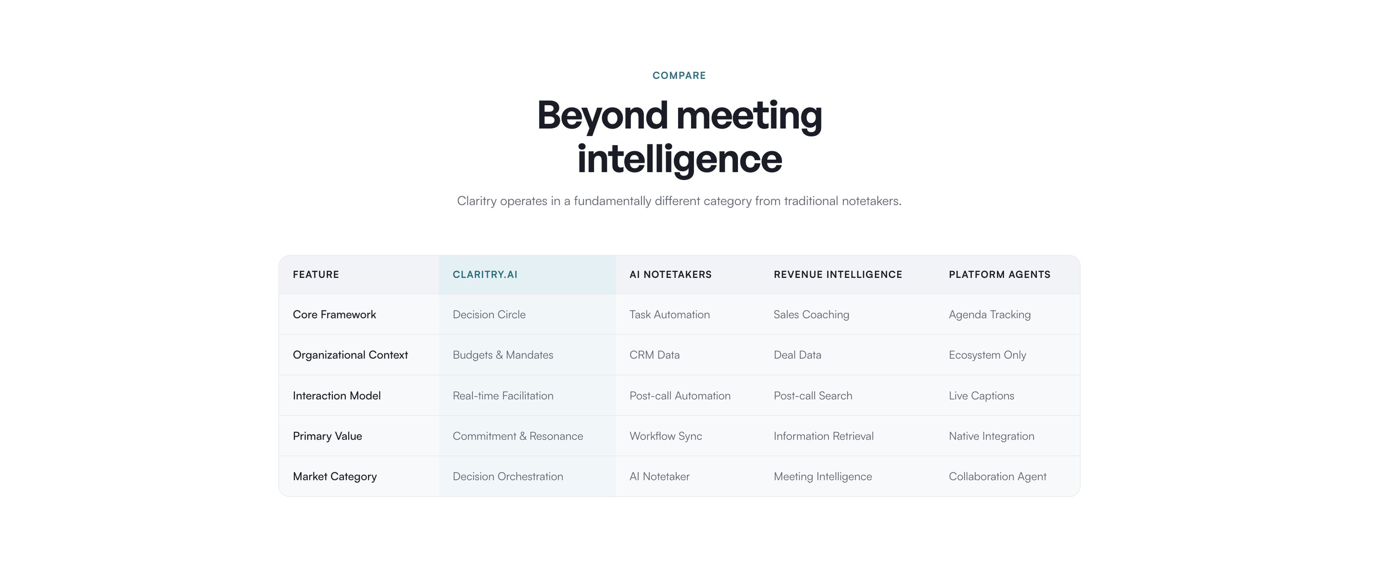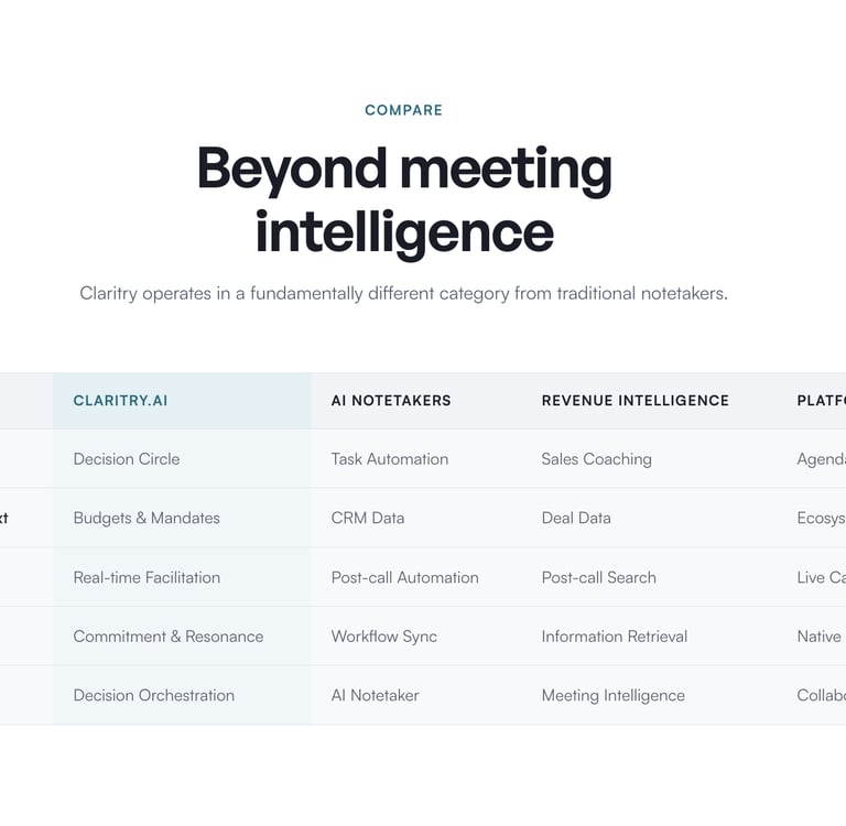 Claritry doesn't just listen. It facilitates, grounds decisions, and drives follow-through — all in real time.